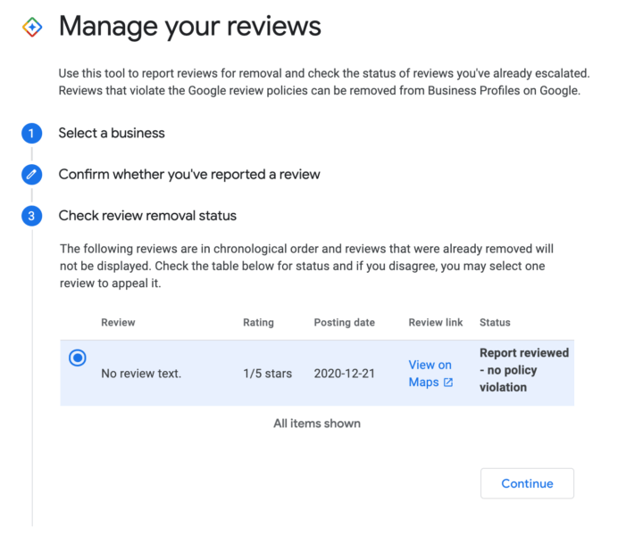 If you choose to report a new review to be removed, Google gives you a list of your recent reviews that you can click to view on Google Maps or submit a takedown request: